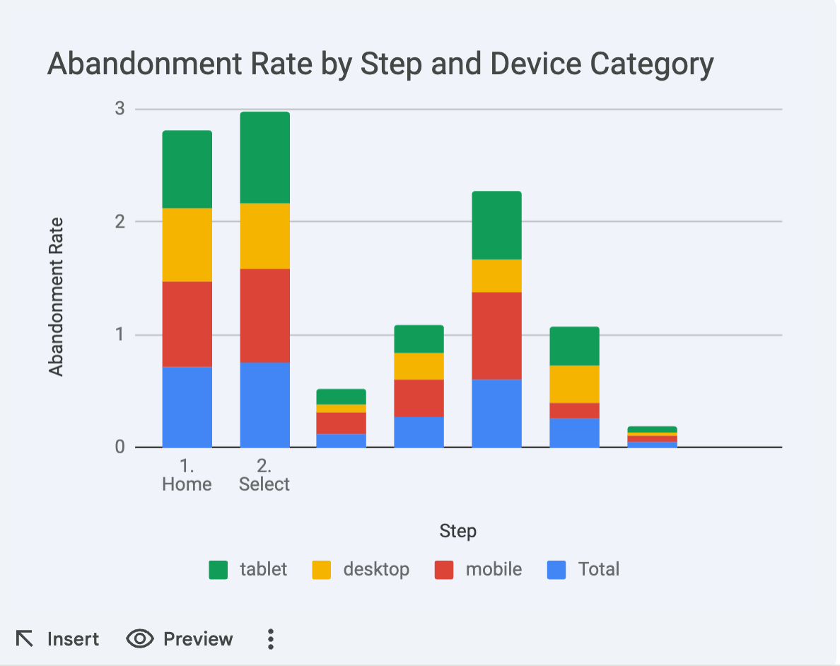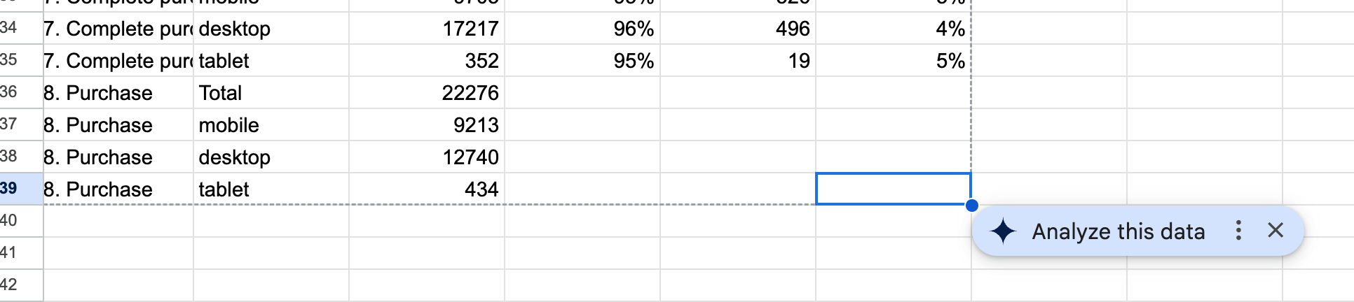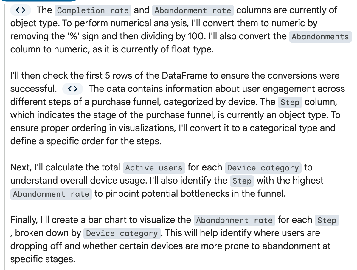 This week, because it is reporting season, I analyzed a purchase funnel using Google Analytics data. I wanted to recreate a simpler version of the funnel, so I exported the GA4 data into a Google Sheet. The sheet prompted me "analyze this data" with Gemini. Ideally, a data export from one company should be interpretable from the AI from the same company, especially when creating a chart directly from the spreadsheet.