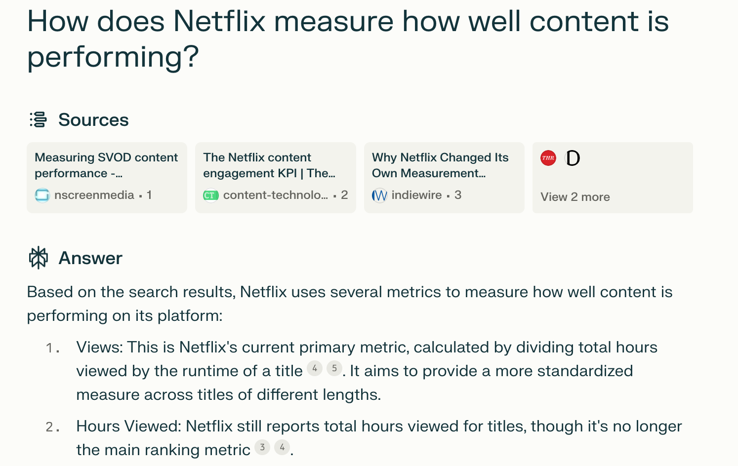These things—gesturing around at crawlers and natural language processing systems—they tend to build on whatever Google does because the search giant leaves a paper trail. I don't know what Perplexity is crawling or how it is putting together its model, but I do know that I'm most likely to find authority in new tools where I have authority in Google. So I asked it how Netflix measures content performance, a topic where I have ranked highly for years.