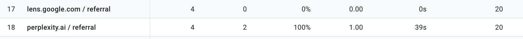 But Perplexity... those users could become valuable. Two users, both engaged, with lower-than-average but still decent time on site... Gonna watch this to see if it converts down the line.