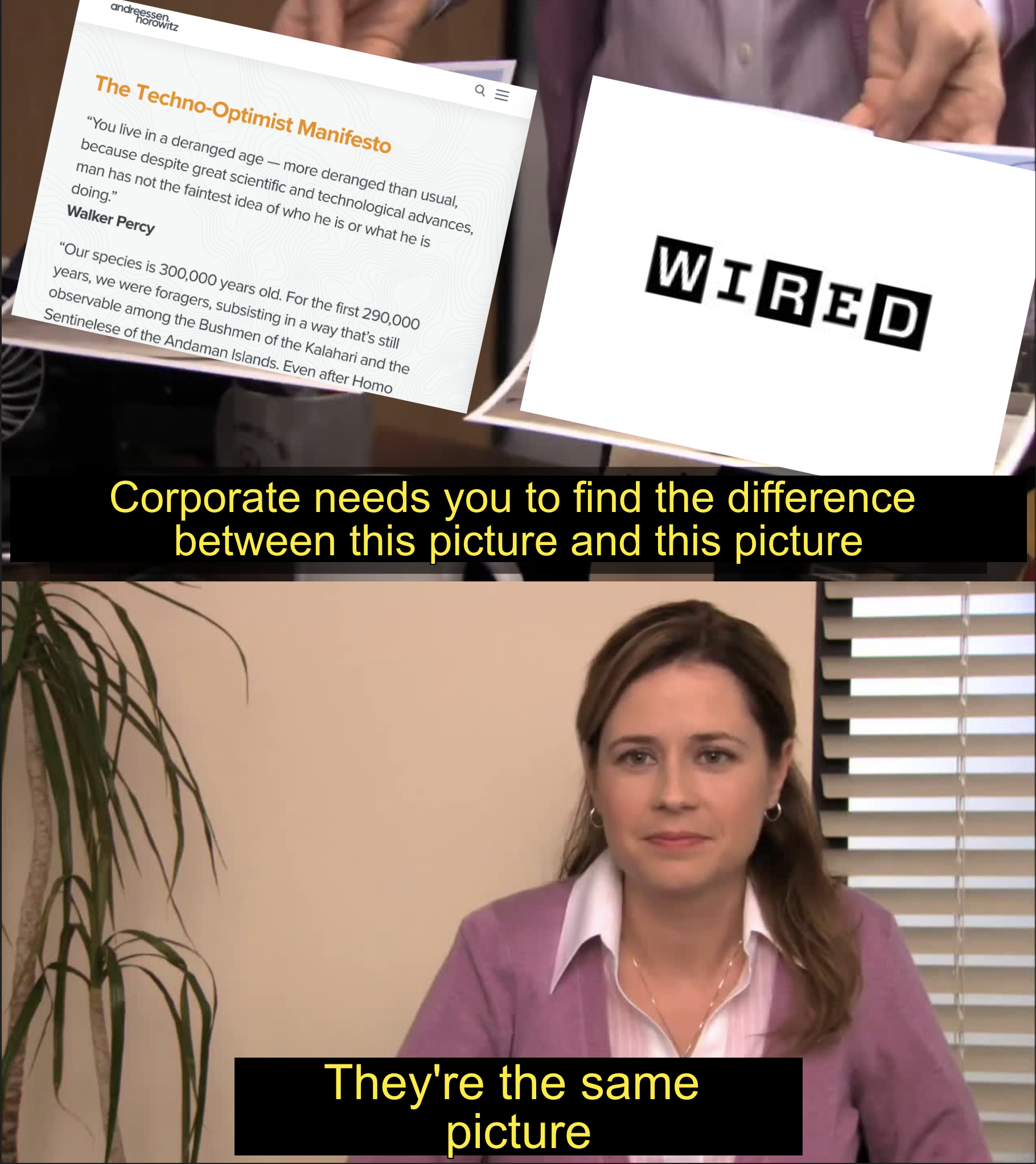 Andreessen's techno-optimism memo, nigh unreadable and dripping with the folk-economics Babbittry of his Midwestern upbringing, clashes once again with the east coast media industry's tired insistence that they are being robbed of their influence without warning. Some other dude brings up Wired, and no one prominent discusses what properly managing networked communications look like at a practical level, even though there are plenty of examples of what good looks like that have existed for years. (I recommend the excellent Everything in Moderation newsletter if you want to learn how actual people are working hard to keep the internet tolerable with laws, policies, and yes, more software.)