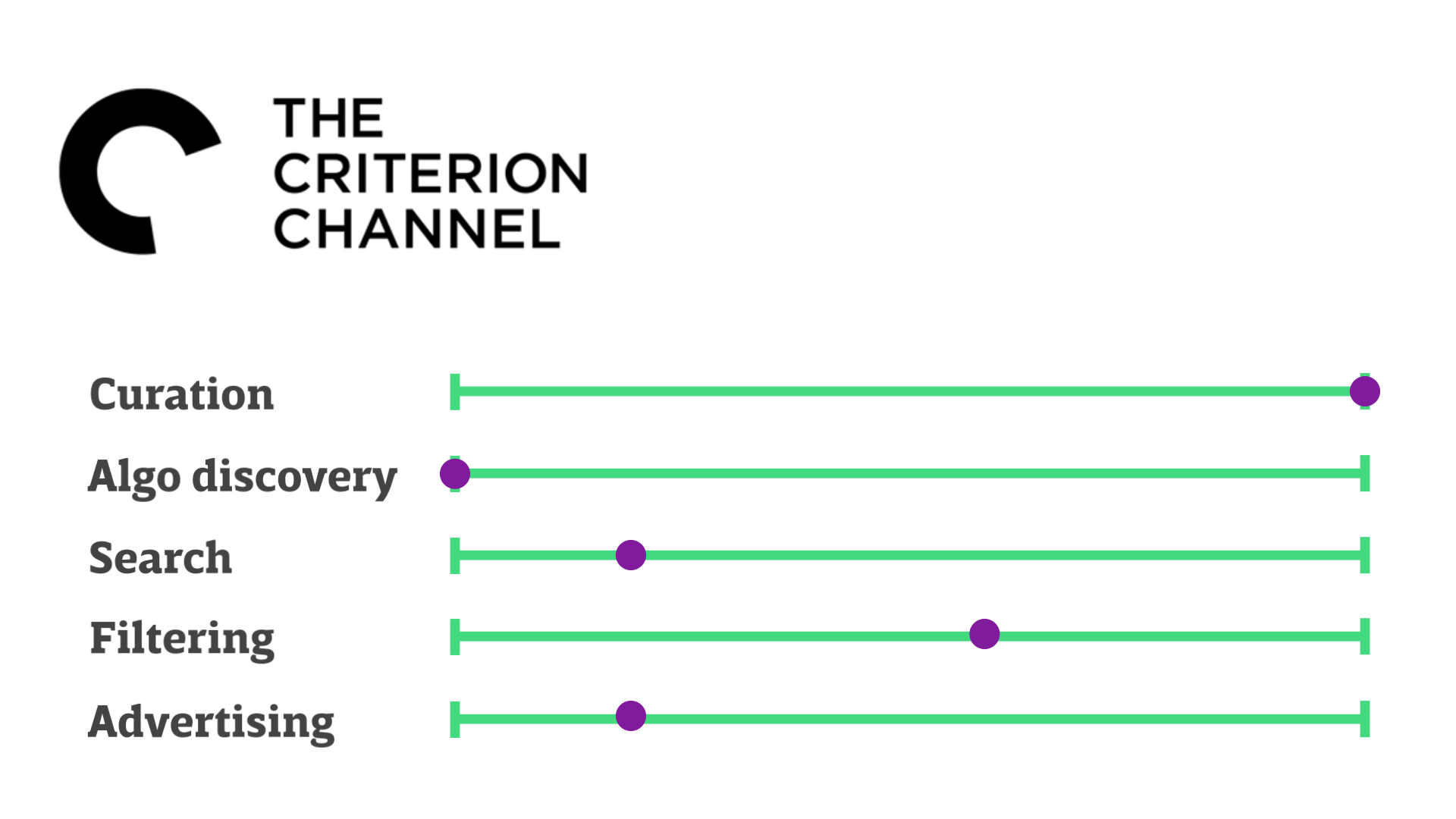 - Advertising: Content is surfaced based on a service's/studio's purchased advertising or marketing plan, usually indistinct from algorithmic curation.