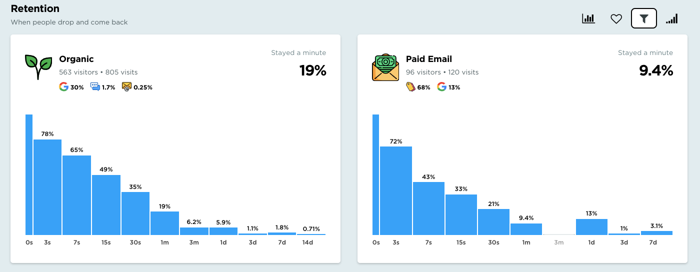 Its icons and charts offer helpful comparative features and explanations, more similar to how Kissmetrics was set up back in the day. Its interface is infinitely less complex than Google Analytics, and it can definitely help new analytics users understand and analyze channel behavior at a glance.